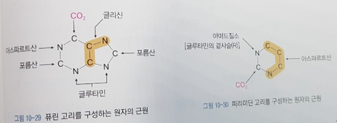 핵산의 구성성분인 퓨린염기(purine base)와 피리미딘 염기(pyrimidine base)는 아미노산을 이용하여 만들어짐. 퓨린염기(아데닌, 구아닌)의 골격부분은 아스파르트산, 글루타민, 글리신으로부터 만들어지고 피리미딘 염기(우라실, 시토신, 티민)의 고리부분 합성에는 아스파르트산과 글루타민이 필요함.