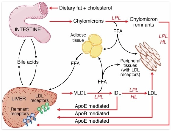 VLDL에서 중성지방이 분해되어 조직으로 유입된 후 형성된 LDL은 콜레스테롤이 차지하는 비율이 높은지단백질임. LDL의 2/3는 LDL, 아포 B에 대한 수용체를 갖고 있는 간이나 다른 조직으로 들어가서 수용체 매개경로로 처리됨. 세포내로 운반된 콜레스테롤에스테로는 가수분해되어 콜레스테롤을 방출하고 세포에서 이용됨.