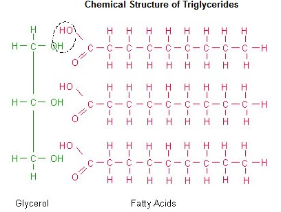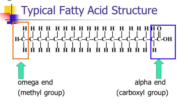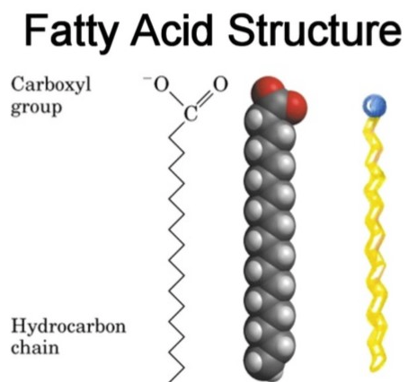 중성지방에 함유된 지방산은 각기 탄화수소 사슬의 길이가 다양하고 탄소와 탄소간 이중결합의 수가 다름. 식품에 함유된 지질에는 4개에서 22개까지 짝수개의 탄소로 이루어진 지방산이 들어있음. 첫 탄소원자는 카르복실기(carboxyl group : -COOH)에 들어있고 마지막 탄소원자는 메틸기(methyl group : CH3)안에 들어 있음. 지방산을 이루는 탄화수소 사슬은 물에 녹지 않는 비극성의 성질을 지니나 카르복실기는 물과 잘 섞이는 극성을 띄고 있음.
