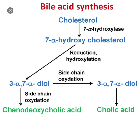 콜레스테롤은 아세틸 CoA로부터 합성되는데 주로 간세포에서 50%, 소장의 상피세포에서 25%정도 생성됨. 따라서 콜레스테롤을 식사를 통해 섭취해야 할 필요는 없음. 음식으로부터 흡수된 콜레스테롤 양에 따라 간에서의 콜레스테롤 합성이 조절됨. 콜레스테롤은 아세틸 CoA와 NADPH로부터 합성되며 3개의 아세틸 CoA로부터 생성되 HMG CoA를 메발론산으로 전환시키며 스쿠알렌을 거쳐서 콜레스테롤이 합성됨. HMG CoA 환원효소는 콜레스테롤의 합성속도를 조절해주는 효소임. 따라서 식사를 통해 콜레스테롤을 다량 섭취하면 항상성을 유지하기 위해 HMG CoA 환원요소의 활성과 합성이 저하되고 음성되먹이기 기전이 작동해 체내합성이 줄어듬. 인슐린이나 갑상선 호르몬은 콜레스테롤 합성을 증가시키고 글루카곤나글루코코르티코이드는 콜레스테롤 합성을 저지시킴.