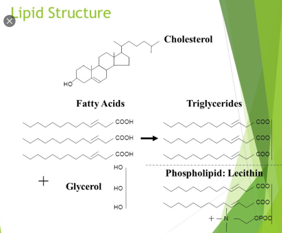 지질은 종류가 다양하여 물에 녹지 않고 유기용매에 녹는 성질을 가짐. 그리고 탄소, 수소, 산소(C,H,O)로 구성된 유기화합물이고 농축 에너지원이며 다양한 분자구조와 형태를 보임.