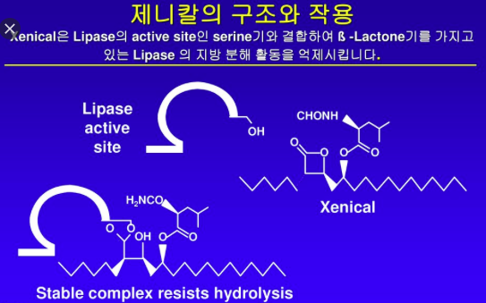 장관내 지방분해효소 저해제로서 위장과 소장의 관강내에서 위와 췌장의 지방분해효소의 활성부위인 세린과 공유결합을 형성하여 지방분해효소를 불활성화함. 지방분해효소가 불활성화되면 중성지방형태의 식이성 지방을 흡수가능한 모노글리세리드와 유리지방산으로 가수분해할 수 없으므로 분해되지 않은 중성지방은 체내로 흡수되지 않아 칼로리 감소를 초래함. 부작용으로 지방변 그리고 지용성 비타민의 흡수장애가 발생함.