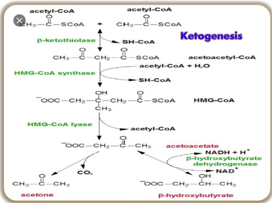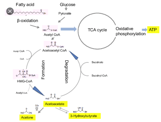 산화의 마지막 단계, 즉 아세틸 CoA가 이산화탄소와 물로 산화되는 과정에 포도당의 분해로 생기는 옥살로아세트산과 결합하는 반응이 필요함. 그러므로 지방산의 완전산화는 지방산이 포도당과 동시에 존재하면서 대사되어야 가능함. 포도당이 부족하면 지방산이 완전하게 산화되지 못하고 중간대사 분해산물인 케톤체로 남게 됨.