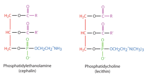 인지질중에서 가장 널리 알려진 물질로는 레시틴lecithin(포스파티딜콜린 phosphatidylcholine)과 세팔린cephalin(포스파티딜에탄올아민)이 있음. 이들은 세포막의 주요구성성분이며 특히 뇌와 신경조직에 다량 함유되어 있음.