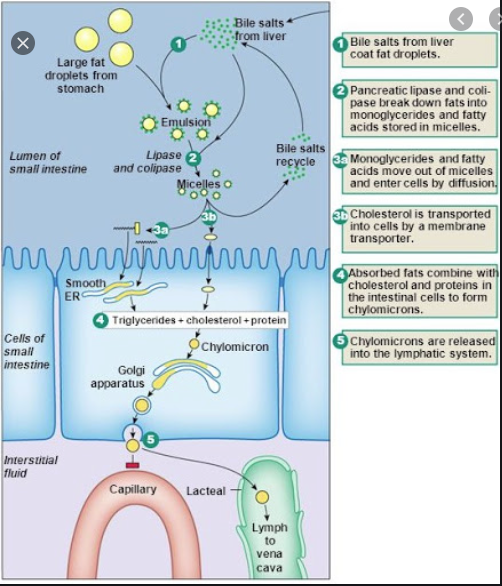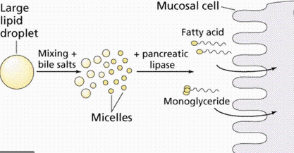 모노글리세리드, 디글리세리드, 지방산, 글리세롤, 콜레스테롤 등이 담즙산염과 음전하를 띤 미셸을 형성함. 담즙은 극성과 비극성인 부분을 함께 가지고 있어서 지질이 지방부분과 결합하여 수용성 용액에 분산될 수 있게 흡수를 도움. 혼합 미셸의 지방산과 모노글리세리드는 소장의 점막세포로 흡수되며 담즙산은 흡수된 후 간으로 가서 담즙이 되어 소장으로 다시 배출됨.
