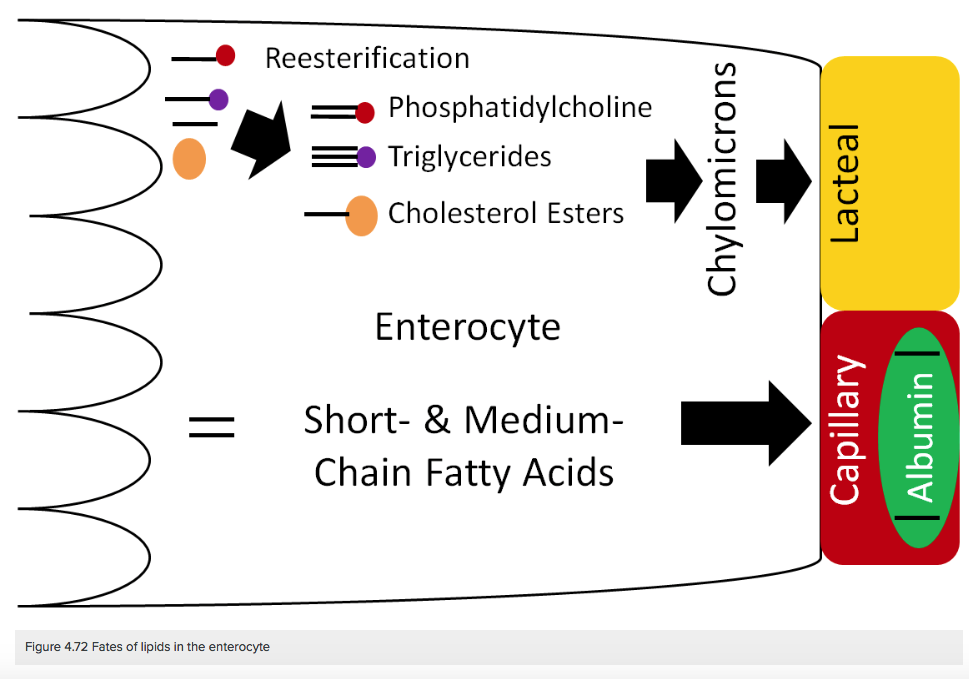 소장의 상피세포로 유입된 긴사슬 지방산은 상피세포안에서 중성지방으로 재합성됨. 흡수된 지방산은 아실 CoA 합성효소에 의해 지방산 아실 CoA로 활성화된 후 2-MG 또는 해당과정을 통해 포도당으로부터 만들어진 글리세롤 3인산에 결합하여 인지질과 단백질에 싸여 지단백질인 킬로미크론을 형성함. 킬로미크론은 림프관으로 들어가 흉관을 통해 간동맥으로 들어가서 간으로 운반됨. 지질이 많은 식사를 한 후 몇시간 뒤 혈액을 뽑으면 크림층이 떠오르는데 이 층의 주된 성분이 킬로미크론임.