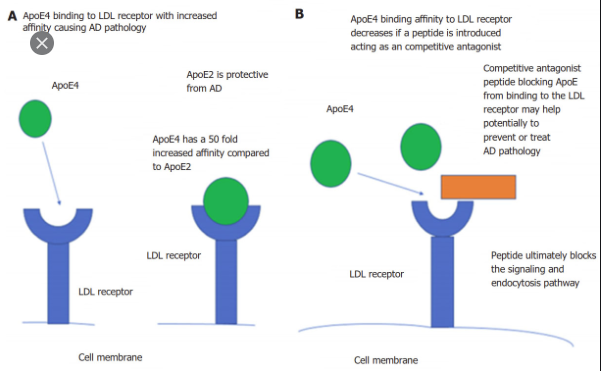 Approximately 13% of the population over the age of 65 years is estimated to have AD. The total number of cases is expected to increase over the coming decades. The apolipoprotein E (ApoE) genotype is the greatest genetic determinant for Alzheimer’s disease (AD) development. The ApoE4 allele increases the risk of AD by 4 to 14 fold while the ApoE2 allele has an opposing effect; decreasing risk. Indeed many studies have demonstrated that carriers of the ApoE2 allele are associated with greater likelihood of survival to advanced age, superior verbal learning ability in advanced age, and reduced accumulation of amyloid pathology in the aged brain. In addition, it is known that ApoE proteins have different affinities for the low-density lipoprotein receptor (LDLR), with ApoE2 having the weakest binding to the LDL receptor at < 2% relative to ApoE3 and E4. Because ApoE2 has shown protective effects in regard to AD, a novel approach for ApoE4 carriers may be to create a peptide antagonist that blocks the ApoE interactions with LDLR at its 135-150 N-terminal binding domain. This peptide may create a more ApoE2-like structure by decreasing the affinity of ApoE4 for LDLR thereby reducing AD onset, memory impairment, and amyloid plaque formation. In this review, we will discuss the different detrimental effects that ApoE4 can cause. Most importantly, we will review how ApoE4 binding to LDLR promotes AD pathogenesis and how blocking ApoE4 binding may be a promising novel therapeutic approach for AD.
