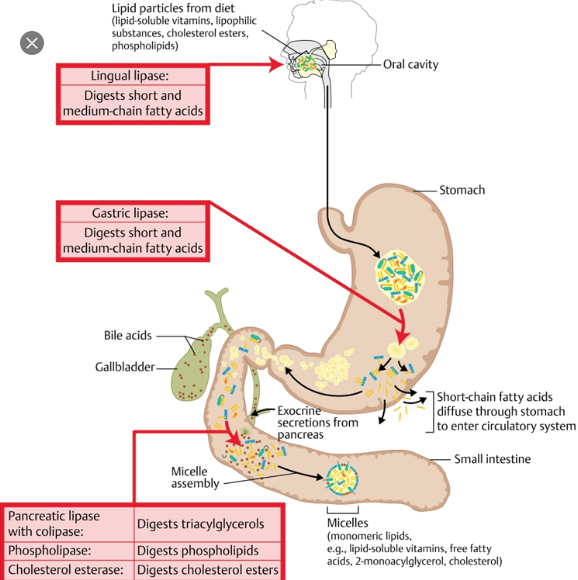구강, 식도, 위 | 구강 리파아제 위 리파아제 | 중성지방 -> 디글리세리드 + 모노글리세리드 + 지방산(주로 짧은 사슬지방산과 중간사슬지방산) |