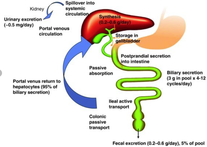 생체내 콜레스테롤은 분해되어 담즙산이 되며 장으로 배출된 담즙의 5%정도는 대변으로 배설되기 때문에 담즙을 통한 담즙산과 유리 콜레스테롤의 분비는 체내 콜레스테롤을 체외로 배설하는 주요 경로임. 그러나 담즙의 약 95%는 문맥으로 재흡수되어 간으로 들어가고 필요시 다시 담즙으로 재배출되는데 이러한 과정을 장간순환이라고 함.