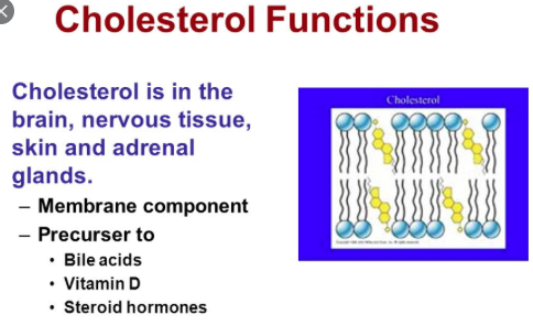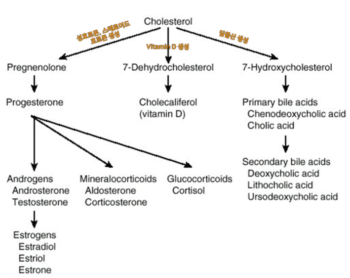 세포막의 구성성분으로 쓰이는 외에도 콜레스테롤은 에스트로겐, 프로게스테론 및 테스토스테론 등의 성호흐몬을 비롯한 여러 스테로이드 호르몬과 비타민 D와 담즙산을 합성하는 전구체로 쓰임. 그러므로 우리 몸은 일정 수준의 콜레스테롤 함량을 유지해야 함.