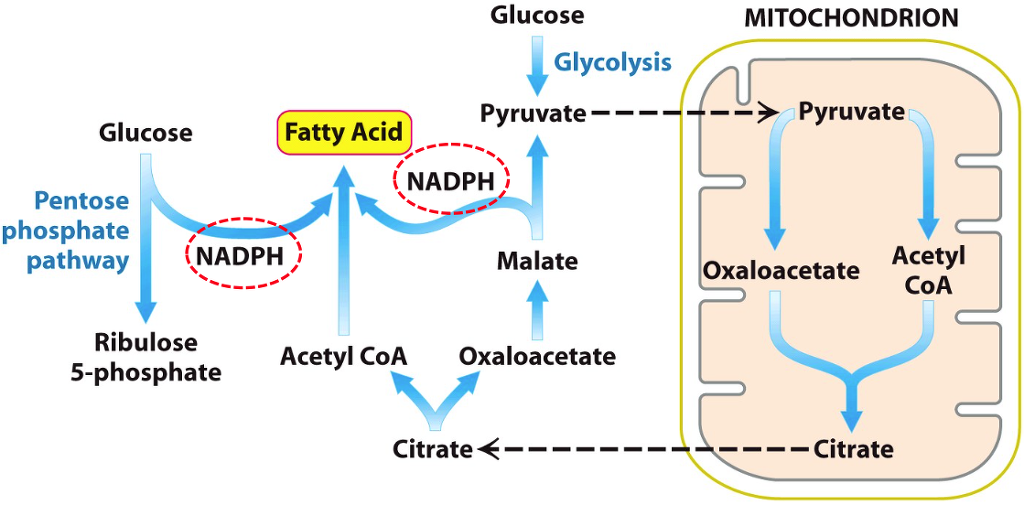 지방산의 합성을 위해 사용되는 아세틸 CoA는 포도당의 산화, 지방산의 산화 및 아미노산 대사 등을 통하여 미토콘드리아에서 생성됨. 그러나 지방산 합성은 주로 세포질에서 이루어므로 아세틸 CoA는 아신카르니틴으로 되어 막을 통과하거나 옥살로아세트산과 결합하여 구연산의 형태로 미토콘드리아 내막을 통과한 후 다시 아세틸 CoA 카르복실화효소에 의해 말로닐 CoA를 형성한 후 지방산 합성효소에 의해 긴사슬 포화지방산(탄소수 16개 palmitic acid)을 합성함.