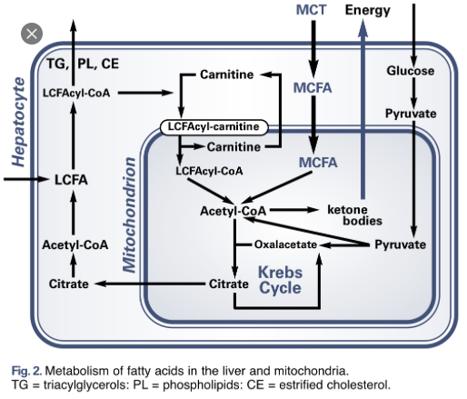 세포질에 있는 지방산은 아실 CoA로 활성화된 후 카르니틴과 결합하여 미토콘드리아 내로 이동한 후 다시 아실 CoA로 전환된 후 베타-산화과정을 거침. 베타-산화과정을 통해 미토콘드리아 내에서 지방산은 베타 위치에 있는 탄소 즉 지방산 아실 CoA의 끝으로부터 2번째 탄소에서 탈수소 반응, 수화반응, 티올분해반응 등에 의해 탄소 수 2개의 아세틸 CoA와 FADH2와 NADH가 생성되며 이들은 전자전달계로 가서 5ATP를 생성함.