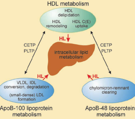 간의 간지방분해효소(Hepatic lipase)는 HDL의 중성지방과 인지질을 분리시켜 HDL3로 전환시켜 간의 HDL 수용체에 결합하여 콜레스테롤을 간에 전달해줌. HDL에 의해 간으로 돌아온 콜레스테롤은 담즙산을 형성하는 전구물질로 쓰임. 담즙에 포함되어 분비된 콜레스테롤은 대변을 통해 체외로 배설되는 과정에 들어가게 됨. 이렇게 HDL은 말초로부터 간으로 콜레스테롤을 전송하는 콜레스테롤 운반체계 역할을 하므로 HDL-콜레스테롤을 좋은 콜레스테롤이라고 부름. 따라서 혈액중에 HDL농도가 낮으면 동맥경화 위험이 높아짐.