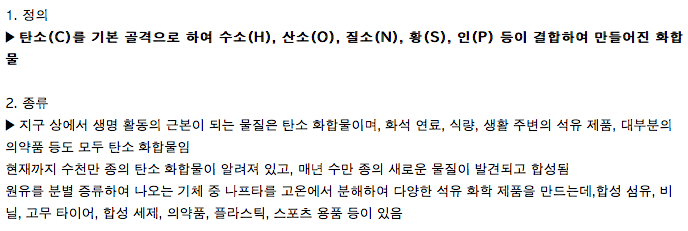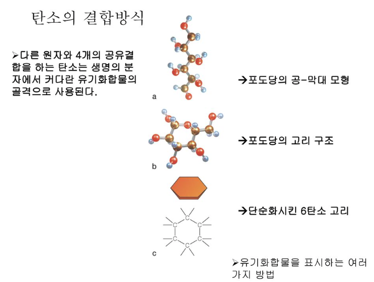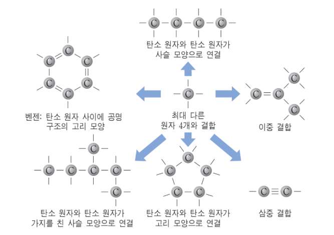 현재 지구에는 118종의 원소가 있는데 이 가운데 유전자 탄생에 가장 중요한 역할을 한 것은 탄소(C)임. 탄소원자는 다른 원자와 결합할 수 있는 전자를 4개나 가지고 있어서 다양한 화합물을 만들어 낼 수 있음. 탄소는 주로 자기들끼리 또는 수소, 산소, 질소 등과 결합하여 다양한 화합물을 만듬. 이를 유기화합물이라 함.