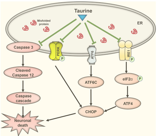 Fig. 1. Neuroprotective effects of taurine against ER stress pathways. During ER stress, three types of ER membrane receptors (PERK, ATF6 and IRE1) located at the ER membrane are activated. Phosphorylated PERK converts eIF2α to phosphorylated eIF2α, which activates ATF4, which translocates to the nucleus and transcribes CHOP. ATF6 is converted to its active form, cleaved ATF6, which also transcribes CHOP. IRE1 is activated by phosphorylation and ultimately potentiates the expression of CHOP. Caspase-12, located on the outer surface of the ER membrane, is cleaved into its active form, which facilitates caspase cascade apoptosis. Taurine exerts neuroprotective effects by inhibiting the activation of PERK, ATF6, IRE1, and caspase-12.