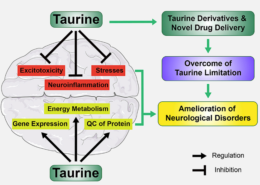 Taurine was first revealed as a constituent of ox bile in 1827 and is a sulfur-containing semi-essential amino acid available in mammals. It plays a crucial role in the developmental processes [[1], [2], [3]]. Taurine is chiefly produced in the liver and kidney; however, it has been found in most other cells and tissues, including the brain, retina, heart, placenta, leukocytes and muscle [4]. It is a crucial factor in various processes such as brain development, optical and immune systems, osmotic regulation, reproduction, stabilization of membranes, cardiac muscle regulation and inflammation [4,5].