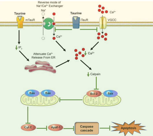 Taurine activated both ionotropic taurine receptor (iTauR) and metabotropic taurine receptor (mTauR). Upon binding with these receptors, activated iTauR inhibits the reverse mode of sodium/calcium exchangers, as well as inhibits voltage-gated calcium channels (VGCC), leads to decreased intracellular calcium. Activated mTauR also decreases IP3 production, which attenuates the release of calcium from the endoplasmic reticulum (ER). As a result, decreases in intracellular calcium inhibit calpain, which ultimately blocks the conformational changes of Bcl-2 and Bax. This inhibits activation of Bax homodimers that target the mitochondrion-mediated neuronal death cascade.