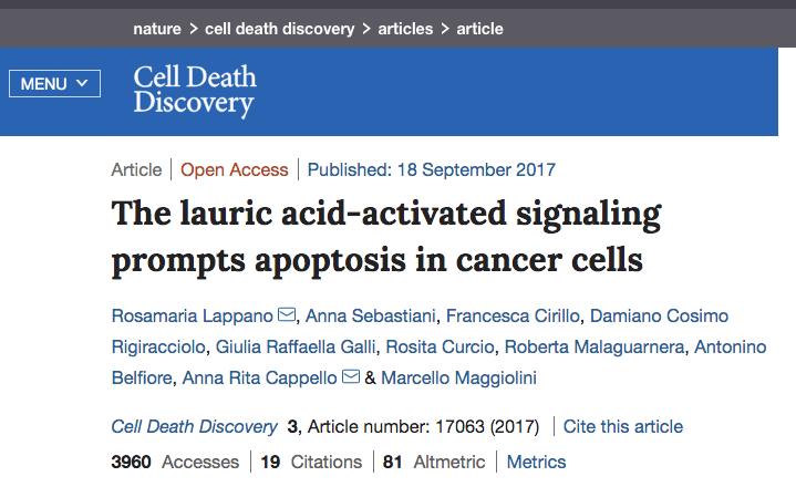 The saturated medium-chain fatty-acid lauric acid (LA) has been associated to certain health-promoting benefits of coconut oil intake, including the improvement of the quality of life in breast cancer patients during chemotherapy. As it concerns the potential to hamper tumor growth, LA was shown to elicit inhibitory effects only in colon cancer cells.