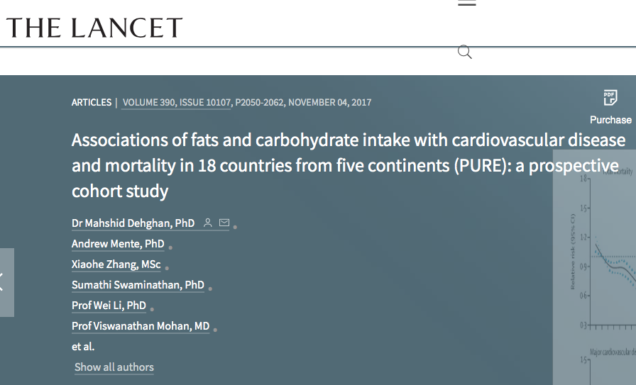 2017년 인기논문 베스트 100가운데 1위는 의학저널 ‘랜싯’에 실린 논문으로 고지방보다 고탄수화물이 건강에 더 해롭다는 내용이다. 캐나다 맥마스터대를 주축으로 한 다국적 공동연구자들은 18개국 13만5335명을 대상으로 평균 7.4년에 걸쳐 식단과 질병, 사망률의 관계를 조사한 대규모 역학 조사다. 그 결과 “고지방 식단이 심혈관계질환을 일으키고 사망률을 높인다는 의학상식이 틀렸다”는 결론을 내렸다.