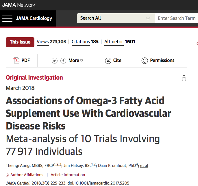 오메가-3 지방산의 심혈관질환 예방효과가 없다는 사실이 최근 미국의사협회지인 JAMA Cardiology에 실렸다. 영국 옥스포드의대 인구보건 분야 임상서비스 및 역학 연구과 Theingi Aung 교수팀이 주도한 것으로, 지금까지 가장 잘 디자인됐다고 평가된 10개의 오메가-3 지방산 연구이다. 환자 7만7917명을 메타분석한 결과 모든 항목에서 오메가 3를 복용한 사람과 비복용자 간의 심혈관 질환사이의 차이는 없었다는 보고다.
