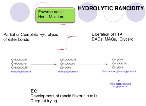 Hydrolytic rancidity refers to the odor that develops when triglycerides are hydrolyzed and free fatty acids are released. This reaction of lipid with water may require a catalyst, leading to the formation of free fatty acids and glycerol.