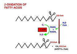 In biochemistry and metabolism, beta-oxidation is the catabolic process by which fatty acid molecules are broken down[1] in the cytosol in prokaryotes and in the mitochondria in eukaryotes to generate acetyl-CoA, which enters the citric acid cycle, and NADH and FADH2, which are co-enzymes used in the electron transport chain. It is named as such because the beta carbon of the fatty acid undergoes oxidation to a carbonyl group. Beta-oxidation is primarily facilitated by the mitochondrial trifunctional protein, an enzyme complex associated with the inner mitochondrial membrane, although very long chain fatty acids are oxidized in peroxisomes.