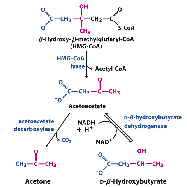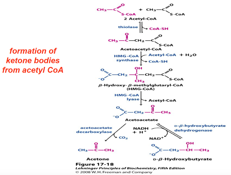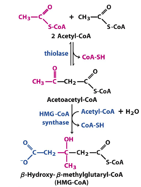 | Thiolysis: The final step is the cleavage of β-ketoacyl CoA by the thiol group of another molecule of Coenzyme A. The thiol is inserted between C-2 and C-3. | β-ketothiolase | An acetyl-CoAmolecule, and an acyl-CoAmolecule that is two carbons shorter |