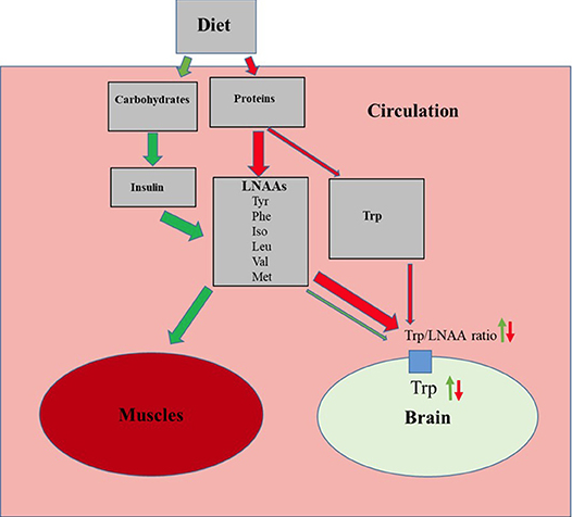Effects of the proteins and carbohydrates on influx of tryptophan (Trp) to the brain. Green arrows indicate activation of carbohydrate induced pathway, resulting increased muscle uptake of large neutral amino acids (LNAAs; Tyr, tyrosine; Phe, phenylalanine; Iso, isoleucine; Leu, leucine; Val, valine and Met, methionine) which in turn increases plasma Trp/LNAA ratio and brain Trp levels. Red arrows indicate how a normal dietary protein source, with relatively low Trp content, decreases the plasma Trp/LNAA ratio and brain Trp levels.