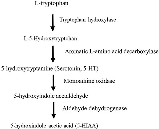 In serotonergic neurons Trp serves as the precursor for 5-HT. The 5-HT metabolic pathway is initiated by Trp being hydroxylated to the intermediate 5-hydroxytryptophan (5-HTP), which is subsequently decarboxylated to become 5-HT. Tissue levels of 5-HTP are usually low since this substance is rapidly decaroxylated by the enzyme aromatic amino acid decarboxylase [for review see (21)]. Thus, the rate limiting step in the biosynthesis of 5-HT is the hydroxylation of Trp which is catalyzed by the enzyme tryptophan hydroxylase (TPH) (Figure 1). This enzyme is specific for 5-HT producing cells, however, it is present in two different isoforms, TPH1 and TPH2 [reviewed in (22, 23)].