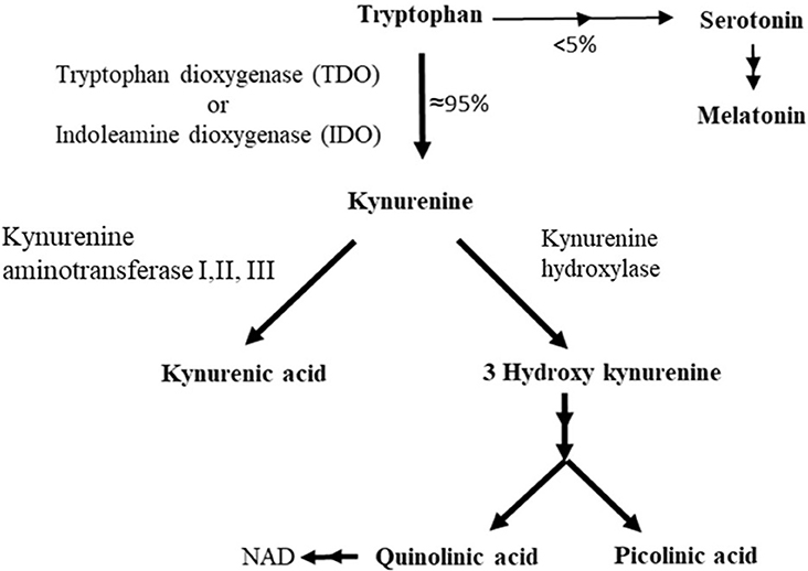 In fact, only a minor fraction of the Trp pool is utilized for 5-HT biosynthesis. In mammals, the majority of Trp enters the kynurenic pathway and is converted to other bioactive substances than 5-HT, such as kynurenic acid and quinolinic acid (Figure 3) [for references see review (11)]. The first stage of this pathway is catalyzed by the hepatic enzyme tryptophan 2,3-dioxygenase (TDO) and the extrahepatic enzyme indoleamine 2,3-dioxygenase (IDO), enzymes that are induced by glucocorticoids and pro-inflammatory cytokines, respectively (34). Thus, chronic stress and infections can shunt available Trp toward the kynurenic pathway and thereby lowering brain 5-HT synthesis while simultaneously increasing the production of other Trp based bioactive substances. Moreover, since a majority of Trp follows the kynurenic pathway (<95%, Figure 3) relative small changes in the activity of this pathway can have rather big impact on the Trp influx to the brain (35). Accordingly, decreased Trp influx to the brain as a result of stress or inflammation/infection induced activation of the kynurenic pathway have been suggested to be an underlying factor for mental illnesses and dysregulation of the neuroendocrine stress axis (12, 14, 15).