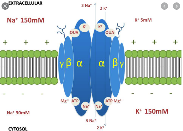 세포막에는 Na+/K+ pump라고 하는 운반체가 있어 농도차에 역행해서 Na+를 세포막 외부로 내보내고 K+를 세포막 내부로 들여 보냄. Na+/K+ pump가 작동하기 위해서는 반드시 에너지가 있어야 함. 이 에너지는 Na+/K+ ATPase에 의해 공급되며 ATP를 분해하여 ADP와 Pi를 생성하는데 ATP 한분자를 가수분해할때 3개의 Na+이 세포밖으로 나가고 2개의 K+이 세포내로 들어옴.