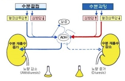 인체는 생리적 상태, 활동정도, 외부환경의 변화 등에 대처하여 호르몬, 효소, 신경자극 등의 방법을 통해 수분의 섭취량과 배설량을 조절함으로써 체내수분함량을 일정하게 유지함.