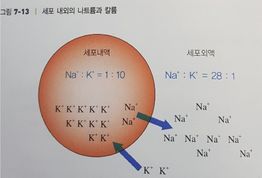 즉 Na+는 세포외액에 세포내액보다 10배이상 많이 들어있고