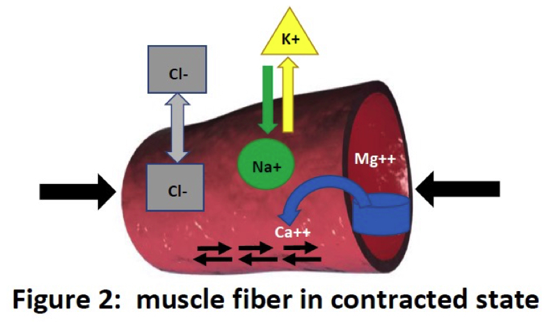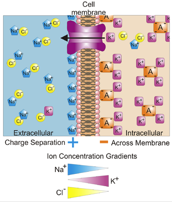 세포내액과 세포외액의 전해질 조성차이로 인해 세포막은 일정한 막전위를 형성하고 있으며 세포가 자극을 받지 않는 안정된 상태에서는 칼륨은 세포내액에 그리고 나트륨은 세포외액에 고농도로 존재함. 세포에 자극이 가해지면 나트륨은 세포외액에서 세포내액으로 들어가게 되고 이를 통해 신경자극의 전달 및 근육수축 현상이 일어나고 곧이어 칼륨은 세포내액에서 세포외액으로 나오게 됨.
