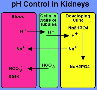 그외에 피부는 땀으로 산을 배출하고 눈물샘은 눈물의 화학적 조성을 변화시켜 pH를 조절함. 하지만 다른 어떤 작용보다 신장에서의 pH조절작용이 큼.