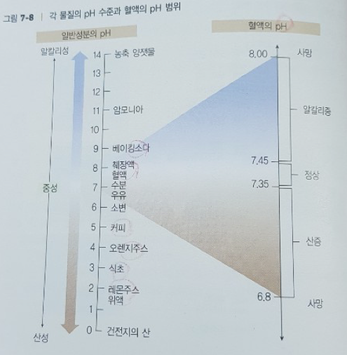 건강한 사람의 혈액은 산도가 pH 7.35~7.45의 매우 좁은 범위내에서 일정하게 유지됨으로써 세포대사가 정상적으로 일어나도록 함.