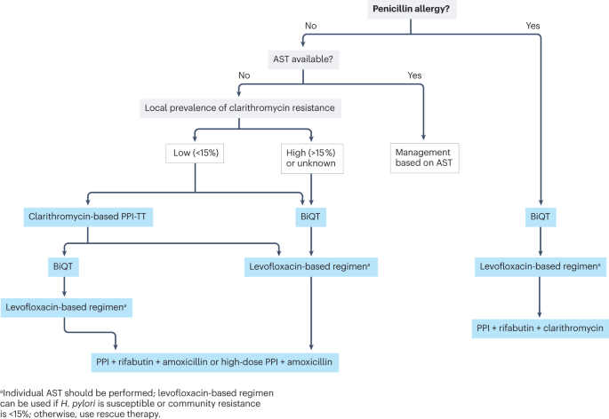Management of refractory H. pylori needs to consider individual or local antibiotic resistance, facilities for AST, logistics, and drug availability244,246 (Fig. 6). Following PPI-TT failure, BiQT or a regimen with antibiotics selected following AST is recommended42,244,247. Empirical therapy, with careful consideration of previously taken medications, is a valid alternative to genotypic resistance-guided therapy of refractory H. pylori infection315. BiQT is currently the best empirical approach as it is not influenced by antibiotic resistance316. If BiQT fails in first-line, levofloxacin-based triple therapy is recommended. A meta-analysis including 25 trials with levofloxacin-based triple therapy in second-line treatment reports a cumulative eradication rate of 74.5% (95% CI 70.9–77.8)317. The PPI-amoxicillin, high-dose, dual therapy is another option, with a ≥81% eradication rate achieved as second-line treatment and with an efficacy comparable to other recommended therapies318,319.