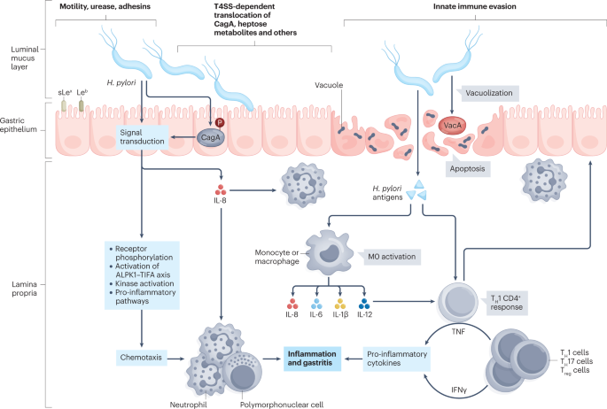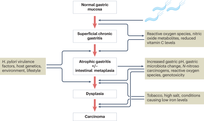 Another approach is to increase the penetration of drugs into the gastric mucus layer, which includes the loosely adherent and firmly adherent mucus layers359. Conventional mucoadhesive particles usually attach to the loosely adherent layer only and are easily moved downstream to the lumen upon peristalsis359. Some potential mucus-penetrating polymeric nanoparticles can penetrate into the firmly adherent mucus layer359. Thus, delivery of selective antibiotics or other agents against H. pylori may be rendered more effective through the development of polymeric nanoparticles. H. pylori is a microaerobic organism and susceptible to increased oxygen levels, thus, the delivery of nanoparticles that include oxygen into the gastric mucus layer could render the bacterium vulnerable. In addition, multiple aspects of the interaction of H. pylori with the gastrointestinal microbiome are addressed by current research and will influence future research360,361,362,363,364. The exclusive property of H. pylori to colonize and infect the gastric mucosa affects the biodiversity of other gastric bacteria and their role in either enhancing or mitigating H. pylori-induced gastric inflammation; this needs to be further explored. H. pylori dominates the mucosa-associated community in the stomach but is less influential on the composition of bacterial communities in gastric juice365. In individuals with H. pylori infection, and even following eradication, the gastric microbial composition is dependent on the extent of gastric mucosal damage previously induced by H. pylori and gastric acidity366,367. In patients with atrophic gastritis, bacterial clusters comprising Peptostreptococcus, Streptococcus, Parvimonas, Prevotella, Rothia and Granulicatella with carcinogenetic potential become predominant, whereas the probiotic Faecalibacterium prausnitzii is depleted367. The development of targeted probiotics in the direction of antagonizing carcinogenic clusters in patients with atrophic gastritis following H. pylori eradication will serve an important purpose. It will be a further point of interest to understand the role of bacteria carried in the saliva and transiting the stomach and whether, in the absence of H. pylori, some of them become candidates for resilience and explain the entity of H. pylori-negative gastritis. The contributing role of bacteria in the development of severe gastritis into gastric cancer is shown in animal experiments and humans, and more insights are expected in this area161,368,369. Vaccine development should be pursued and lessons from previous failures will help in new approaches172.