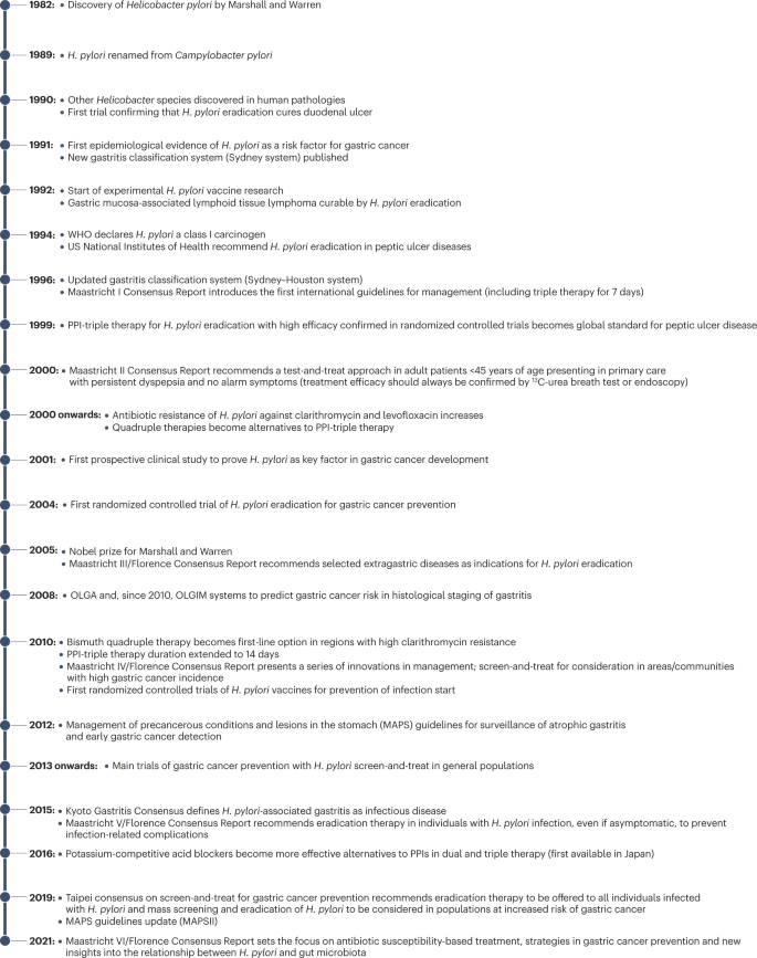 The milestone discovery of H. pylori invalidated the dogmatic assumption of the acidic stomach as a sterile organ. This finding required a fundamental revision of gastric pathophysiology and gastroduodenal pathologies. Although spiral microorganisms in the stomach had been reported6, it was not until 1982 that Warren and Marshall identified a bacterial infection as the cause of chronic gastritis and succeeded in isolating the responsible microorganism7 (Fig. 1). The proof of concept that H. pylori infection causes gastritis was obtained by voluntary self-experiments with ingestion of a bacterial broth and cure of gastritis following H. pylori eradication (that is, fulfilment of the Koch’s postulates)8,9. The Koch’s postulates requires proof of causality for a pathogen to induce disease and cure of disease when the causal agent is removed — this finding was eventually confirmed in clinical trials10. The bacterium originally referred to as Campylobacter pylori (C. pyloridis) became reclassified as H. pylori in 1989 (ref. 11). Peptic ulcer, considered an acid-driven disease in the traditional pathophysiological concept, became an infection-driven disease12,13,14. The standard therapy with long-term acid suppression became short-term H. pylori eradication therapy14. For the discovery that eventually led to the permanent cure of peptic ulcers by H. pylori eradication, Marshall and Warren were awarded the Nobel prize in Physiology or Medicine in 2005 (ref. 15). To this day, continuous scientific progress and new clinical developments have led to frequent modifications and updates to the clinical management of H. pylori10.