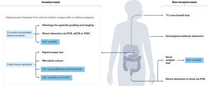 침습적, 내시경 기반 및 비침습적 방법이 H. 파일로리 감염의 진단에 사용됩니다.