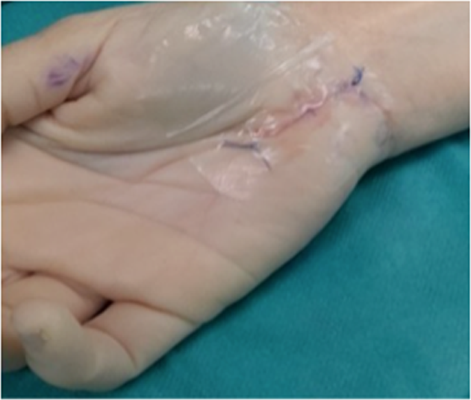 Open carpal tunnel surgical release of the carpal ligament was performed by experienced surgeons who were blinded to the group allocation of each patient. Once the surgery was completed and the wound sutured, a cannula was inserted through the incision and 3 mL of the PRP or PPP fraction was injected according to the patient’s group allocation. Finally, an occlusive semi-permeable dressing was applied (Fig. 1). All the patients underwent the same standardized post-surgery rehabilitation protocol.