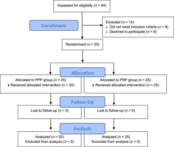 Sixty-four patients diagnosed with mild to extreme CTS were assessed for eligibility, and 50 were finally enrolled; they were block-randomized in a 1:1 ratio either into the PRP (n = 25) or PPP group (n = 25) by an independent researcher using a computerized random number generator. The assignment was concealed from the patients and all the study personnel throughout the duration of the trial.