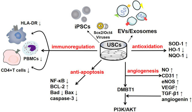 Similarly, most studies have shown that USCs exert therapeutic effects via paracrine mechanisms, which can be activated by extracellular vesicles (EVs), including exosomes and microvesicles. Jiang et al. first extracted exosomes from USCs after finding spherical vesicles that were approximately 50–100 nm in size (Jiang et al., 2016). Subsequently, Liu et al. found that these exosomes had the potential to facilitate angiogenesis and promote cell survival by producing growth factor (GF) and transforming growth factor-β1 (TGF-β1) (Liu and Wu, 2020). Studies have shown that, compared with USC implantation, USC-EV implantation has similar or even better therapeutic effects and that these cells possess the immune-privileged characteristics of their original cells. Moreover, USC-EVs are easier to store and manage and have a lower risk of tumour formation. USC-EV treatment is a superior strategy due to their efficacy, convenience and safety (Basu and Ludlow, 2016). Additionally, USC-derived induced pluripotent stem cells (USC-iPSCs) have recently become a hot research topic. These cells have been reprogrammed by retroviruses, mRNA transfection, and Sendai viruses, as exhibited by their high expression of the pluripotent genes SOX2, OCT4, NANOG, and CRIPTO/TDGF1 (Wang et al., 2017a; Cao et al., 2018; Kim et al., 2020b). Thus far, USC-iPSCs have been reported to rapidly proliferate and efficiently differentiate into many cell types with higher yields and less immunological rejection, mainly in endocrine systems (Guo et al., 2017a; Guo et al., 2017b) and digestive systems (Niemietz et al., 2016). In addition, USC-iPSCs can potentially be used to establish disease models based on their ability to provide an unlimited source of cells with the same genes as diseased cells (Fus-Kujawa et al., 2021). However, iPSCs are characterized by genetic instability and self-renewal ability, especially in regards to undifferentiated pluripotent stem cells forming tumours in the body, which is particularly worrying. In response to this problem, Ben-David et al. proposed the use of a small molecule targeting stearoyl-CoA desaturase 1. The molecule can selectively induce the death of undifferentiated iPSCs/ESCs and may be an effective therapeutic strategy with an improved safety profile. However, current research on the risk of using USC-iPSCs is limited, and these cells may become the focus of future research (Ben-David et al., 2013; Barreca et al., 2020). In the future, USC-iPSC-based treatment could potentially benefit humans.