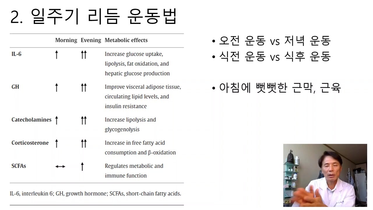 일주기 리듬운동을 해야 활성산소가 안만들어지고 만성염증이 제거된다. 오토파지가 일어나고 건강한 세포가 더 건강해진다.