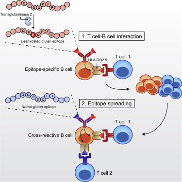 변형된 글루텐 펩타이드가 B cell의 표면에 있는 BCR(B cell receptor)에 결합되어 B세포에게 항원정보를 전달한다. 이후 B세포는 이 항원이 신체의 일부인지(자기 인지) 문제가 있는 외부항원인지 구분 후에 표면에 있는 HLA-DQ2.5 (Human Leukocyte antigen) 을 통해 T cell(CD4+ T cell = helper T cell)에게 탈아미드화된 글루텐 펩타이드가 항원이라는 정보를 전달한다.