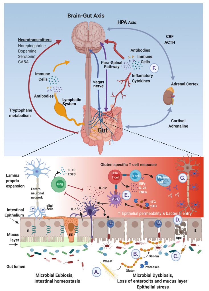 장 내부에 누적된 글루텐 유래 물질들은 면역반응 활성화로 염증반응을 유도하여 장의 투과도를 증가시키고 장 장벽을 손상시킨다. 더 나아가, 이것이 자가면역질환, 신경퇴행성 질환으로 이어질 수 있다. 그리고 장내에서 일어나는 면역반응, 염증반응은 장내 미생물총에 영향을 끼쳐서 장내 환경을 더욱 악화시킨다.