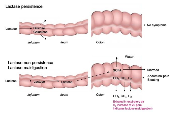 소장내 흡수되지 않은 유당은 삼투압부하를 만들어서 체내에서 장내로 액체나 전해질들이 분비되게 만든다. 또한 소화되지 않고 쌓인 유당들은 장내미생물에 의해 발효되어 수소, 이산화탄소, 메탄 등의 가스들이 장내에서 생성된다. 이러한 삼투압 증가와 가스생성으로 인하여 위장관내 여러 불편한 증상들이 생길 수 있다.