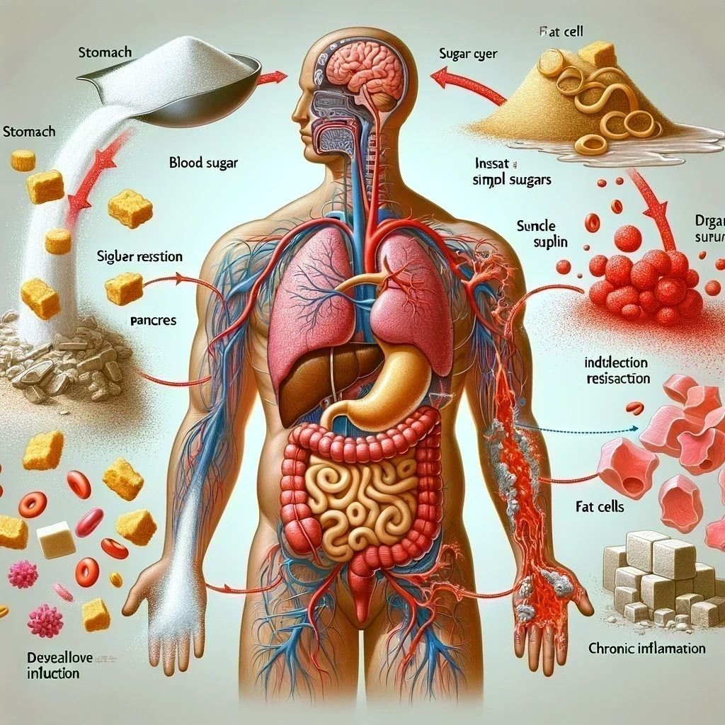 (DALL E - 단순당을 복용했을때 혈당이 높아지고, 인슐린 저항성, 만성염증이 생긴다는 모식도)