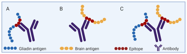뿐만아니라, 흥미롭게도 글리아딘에 대한 항체는 GAD65라는 효소에도 반응하는데 GAD65 효소는 GABA 생성에 관여하는 효소이기도 하다. 글루텐을 섭취함으로써 생기는 항체가 GAD65 효소를 공격하고, 이에 신경전달물질인 GABA의 생성량이 저하된다. 결과적으로 GABA가 부족해져서 GABA와 관련된 신경질환이 생길 수 있다.