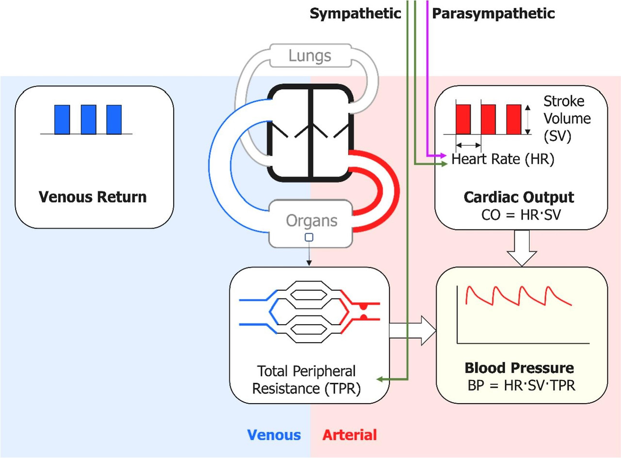 When the baroreflex is triggered by hypotension, the parasympathetic response consists of a decrease of vagal drive to the heart that increases heart rate (HR) (Fig. 1). This will increase cardiac output (CO), driving more blood into the arteries. The sympathetic response results in an increase in activity to the heart that also increases HR, as well as an increase of impulses to arterioles that result in more vasoconstriction, increasing total peripheral resistance (TPR), thereby impeding blood flowing out of the arteries. The dual effects of driving more blood into the arteries while impeding blood flowing out them increase arterial BP (Fig. 1). An initial disturbance in the form of a BP increase will have opposite effects on HR and TPR, so BP will decrease. A fundamental feature of baroreflex control is the reciprocal relation between changes of BP and HR: BP decreases are normally accompanied by HR increases, and vice versa.